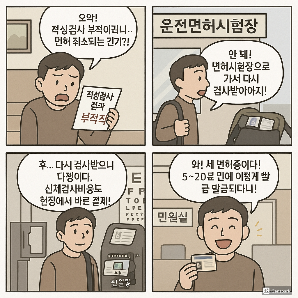 * 절차: 면허시험장 내 신체검사장에서 신체검사 → 민원실 접수 → 발급 (5~20분 소요)